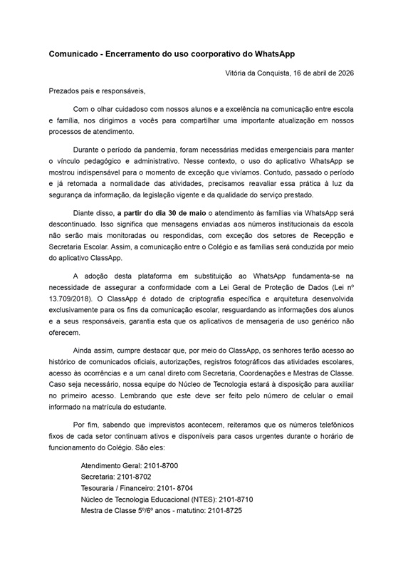 Vitória da Conquista, 16 de abril de 2026 Prezados pais e responsáveis, Com o olhar cuidadoso com nossos alunos e a excelência na comunicação entre escola e família, nos dirigimos a vocês para compartilhar uma importante atualização em nossos processos de atendimento. Durante o período da pandemia, foram necessárias medidas emergenciais para manter o vínculo […]