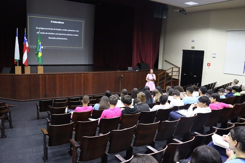 Tivemos a participação especial da professora convidada Andreia Abade, que ministrou uma palestra com ênfase na Constituição Cidadã (1988), enriquecendo o debate e fortalecendo a formação crítica e cidadã dos estudantes.