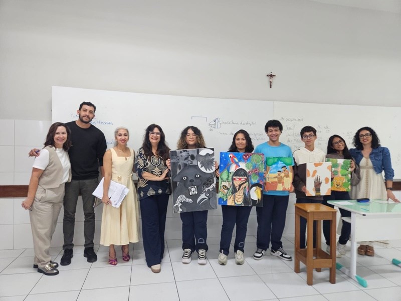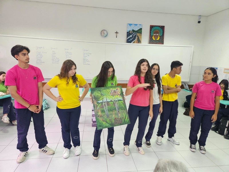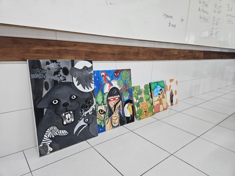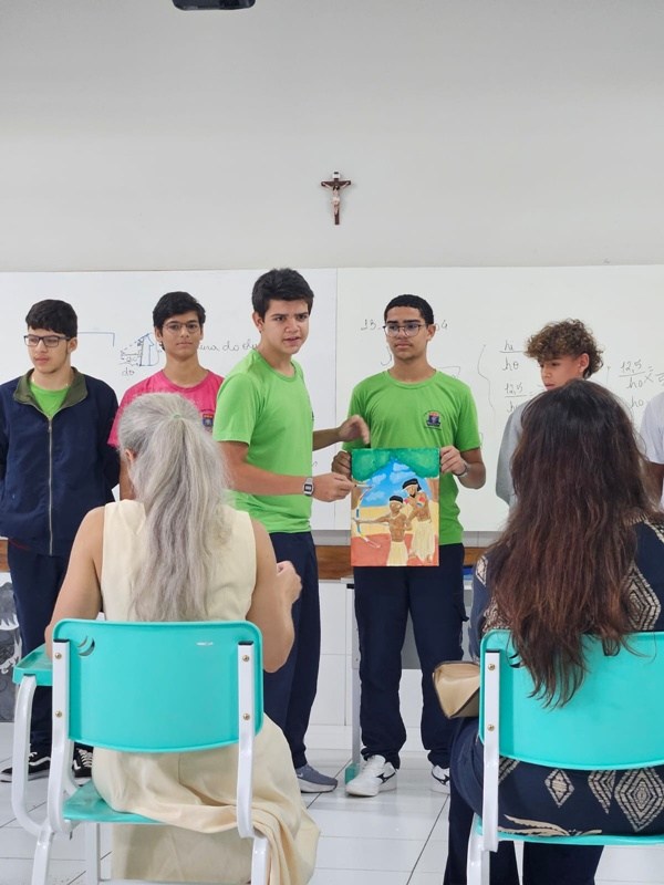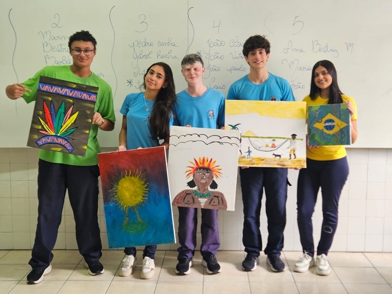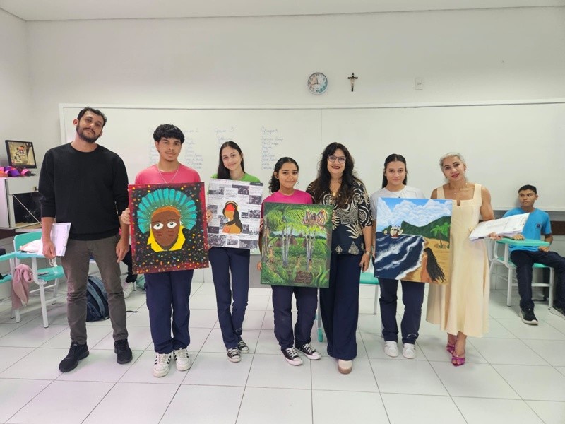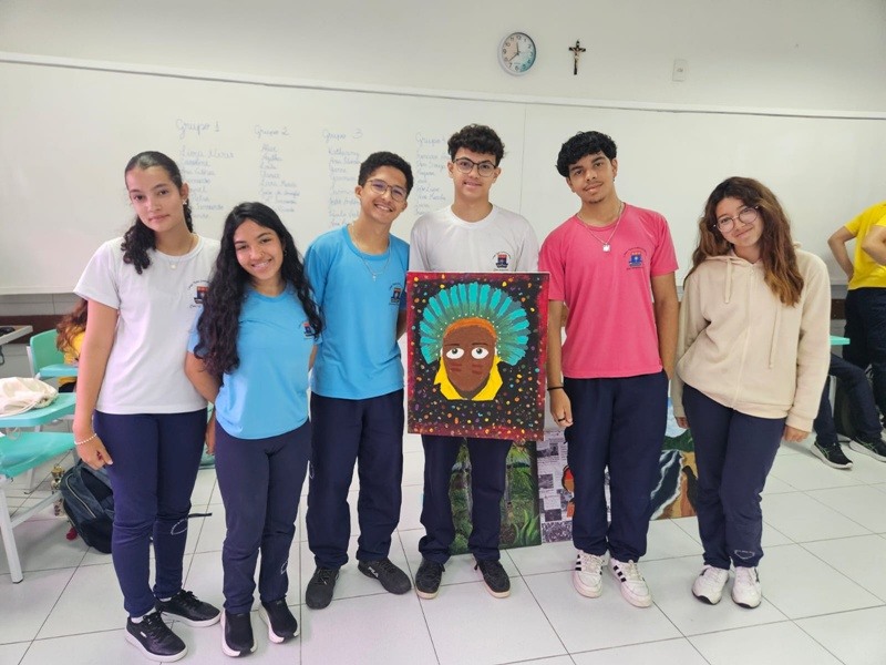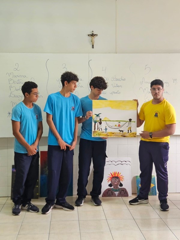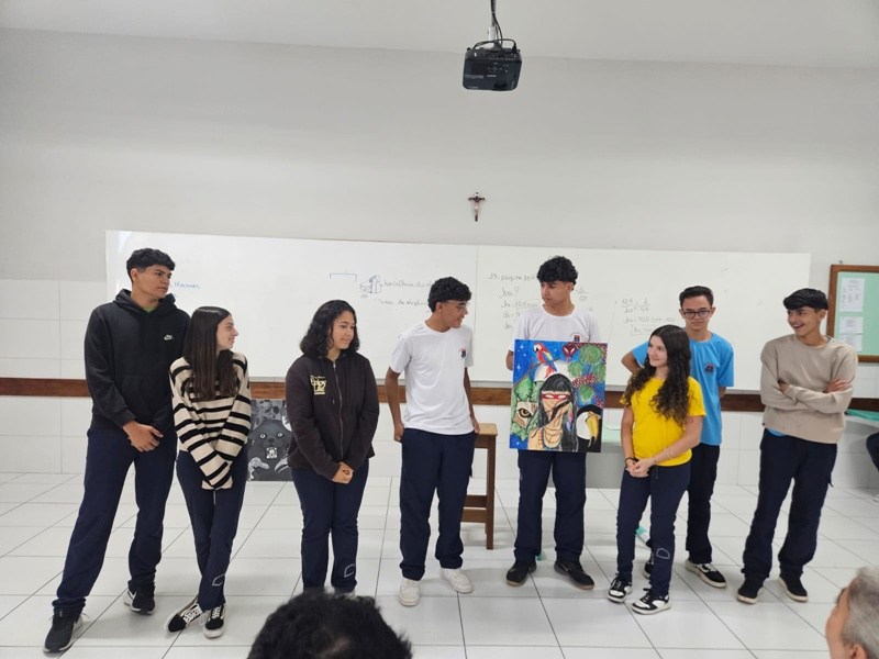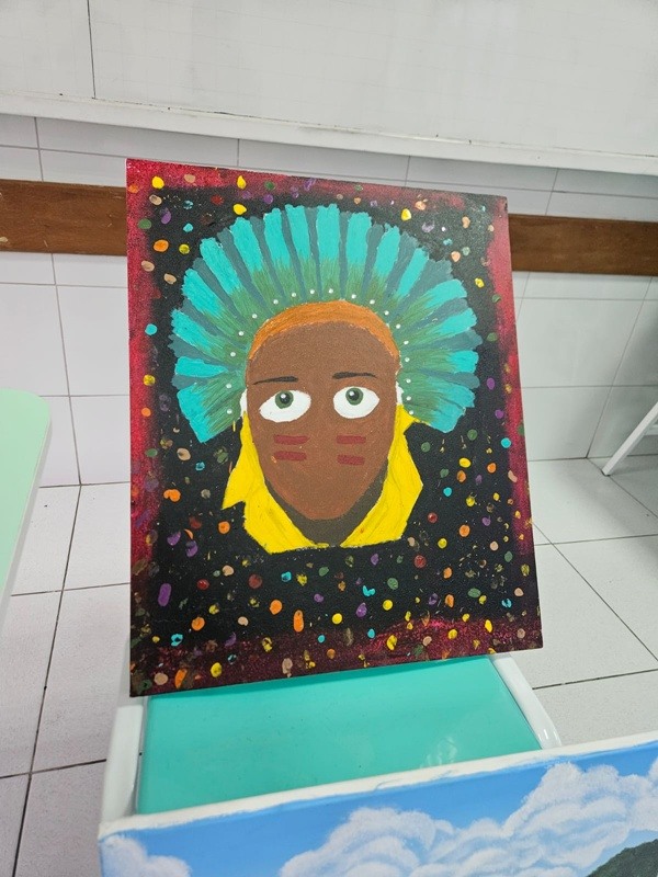Inspirados pelos povos originários, suas cosmovisões e riquezas culturais, os estudantes transformaram suas reflexões em telas cheias de significado — a partir de uma perspectiva decolonial que valoriza saberes ancestrais, questiona visões eurocêntricas e amplia o olhar sobre a diversidade cultural. Além das produções visuais, os alunos também compartilharam suas ideias com muita expressividade na oralidade, fortalecendo o pensamento crítico e o respeito às múltiplas vozes da nossa história.