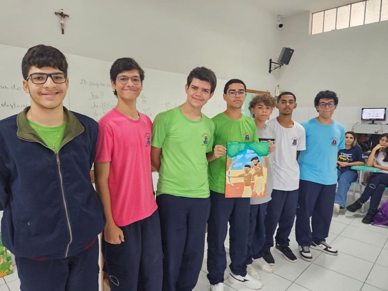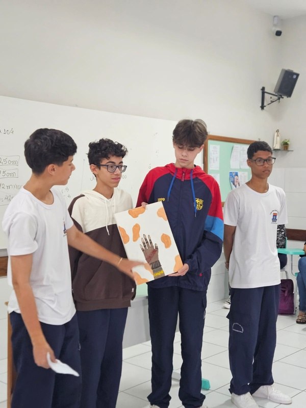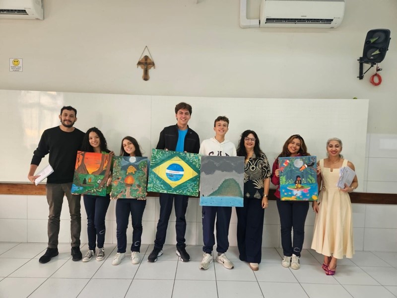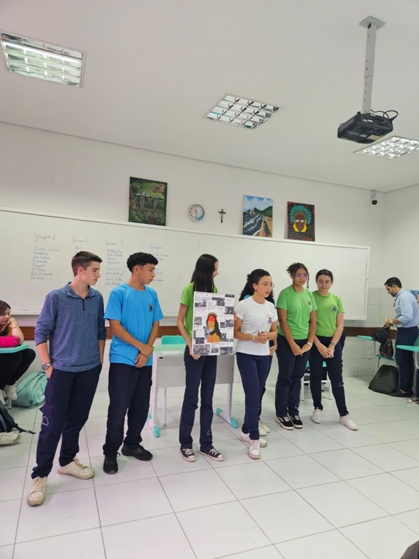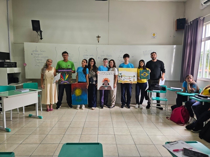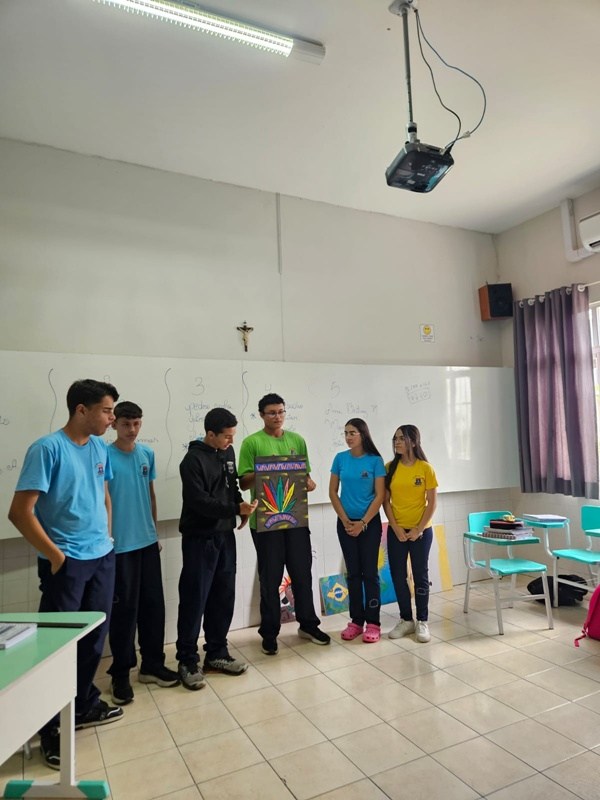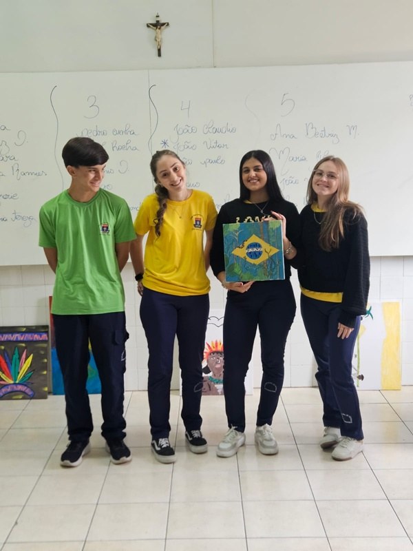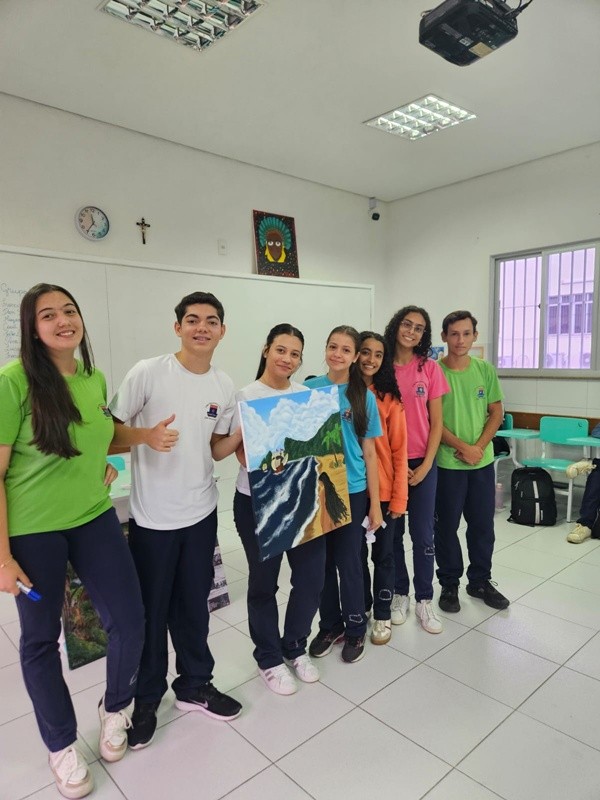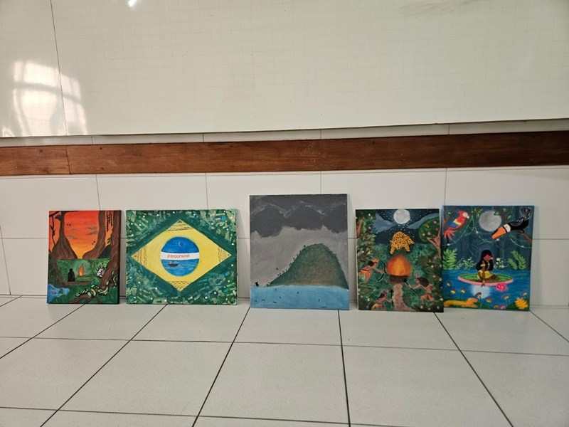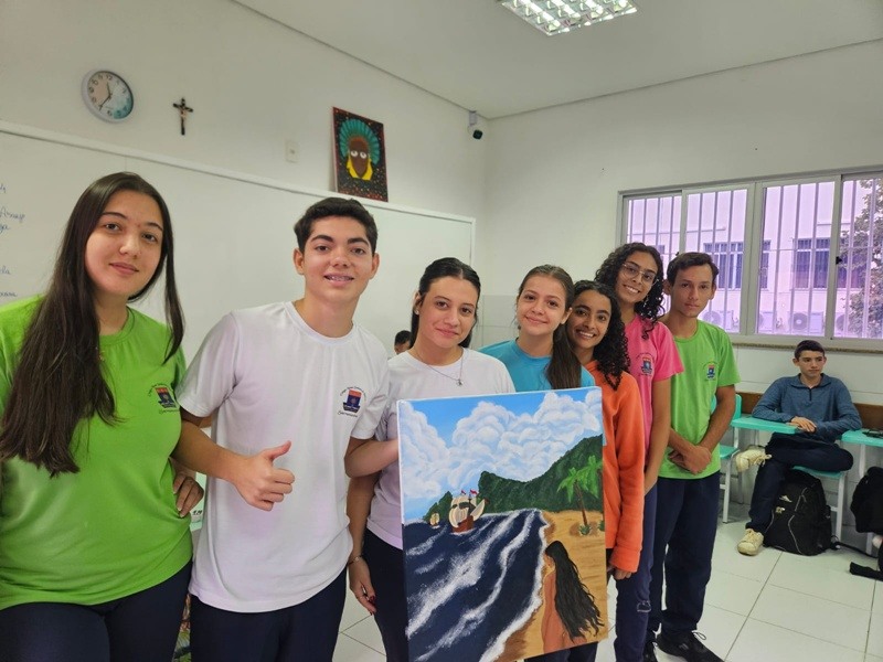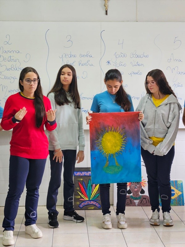 Inspirados pelos povos originários, suas cosmovisões e riquezas culturais, os estudantes transformaram suas reflexões em telas cheias de significado — a partir de uma perspectiva decolonial que valoriza saberes ancestrais, questiona visões eurocêntricas e amplia o olhar sobre a diversidade cultural. Além das produções visuais, os alunos também compartilharam suas ideias com muita expressividade na oralidade, fortalecendo o pensamento crítico e o respeito às múltiplas vozes da nossa história.