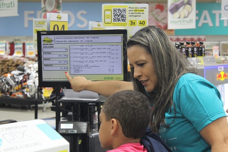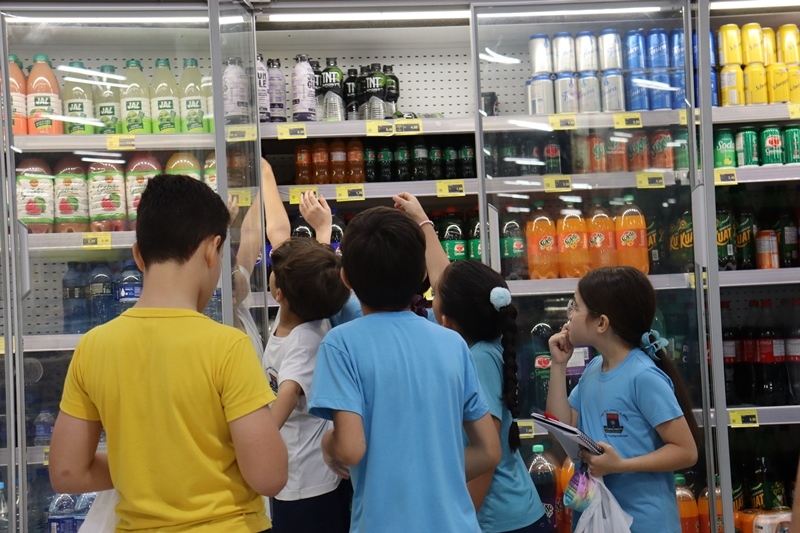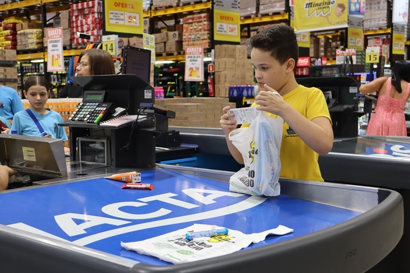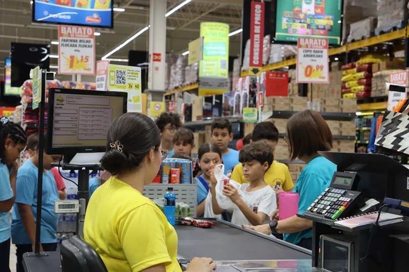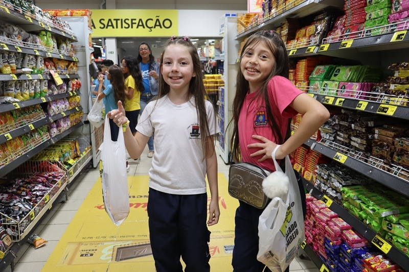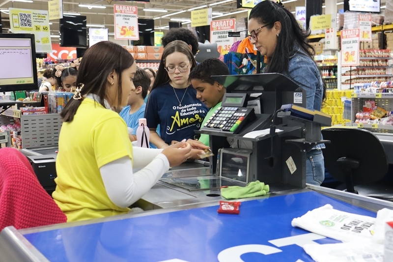 Durante a atividade, abordaram temas como consumo consciente, comparação de preços, prazos de validade, leitura de rótulos, identificação de promoções, dentre outros.